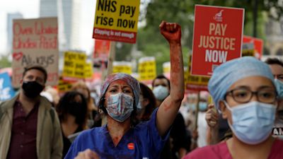 The Tories have been blasted for their shameful treatment of NHS workers after a pay rise. Their gross total hourly income before deductions is 5421 per hour. NHS staff march through central London during a protest demanding a 15 per cent pay rise for healthcare worker July 3 2021 Credit.